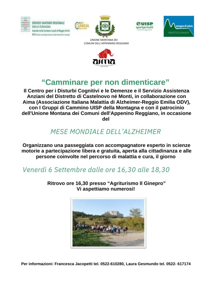 In occasione del Mese mondiale Alzheimer, il Centro per i Disturbi Cognitivi e le Demenze ed il Servizio Assistenza Anziani del Distretto di Castelnovo ne’ Monti, in collaborazione con UISP, AIMA Reggio Emilia, con i Gruppi di Cammino UISP della montagna e con il patrocinio dell’Unione Montana dei Comuni dell’Appenino Reggiano, organizzano una passeggiata con accompagnatore esperto a partecipazione libera e gratuita.