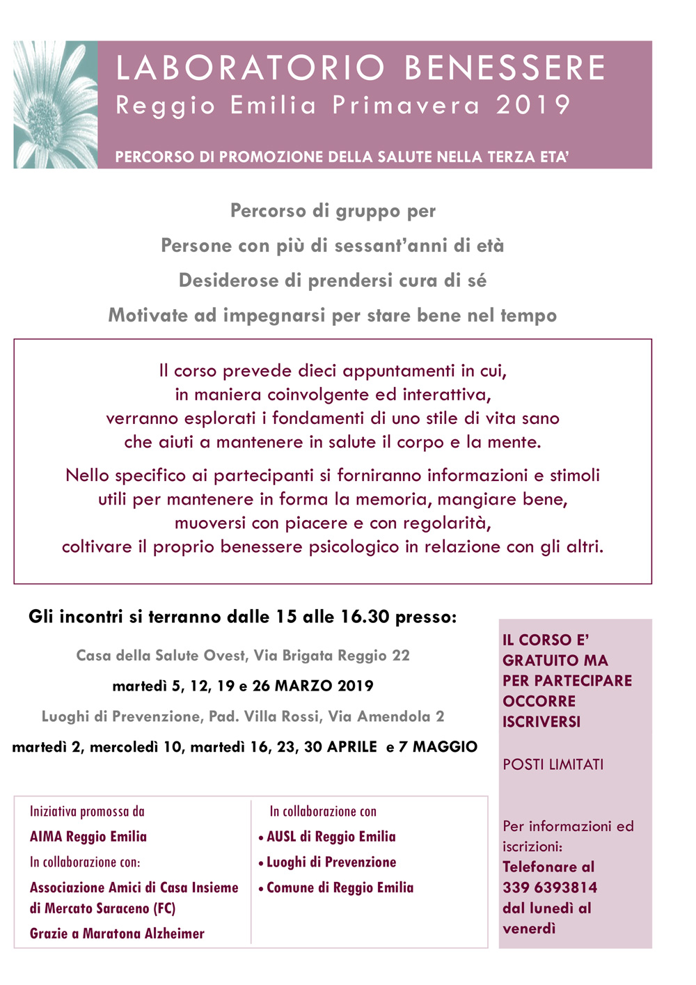 - martedì 5, 12, 19 e 26 MARZO 2019 presso la Casa della Salute Ovest, via Brigata Reggio 22, Reggio Emilia