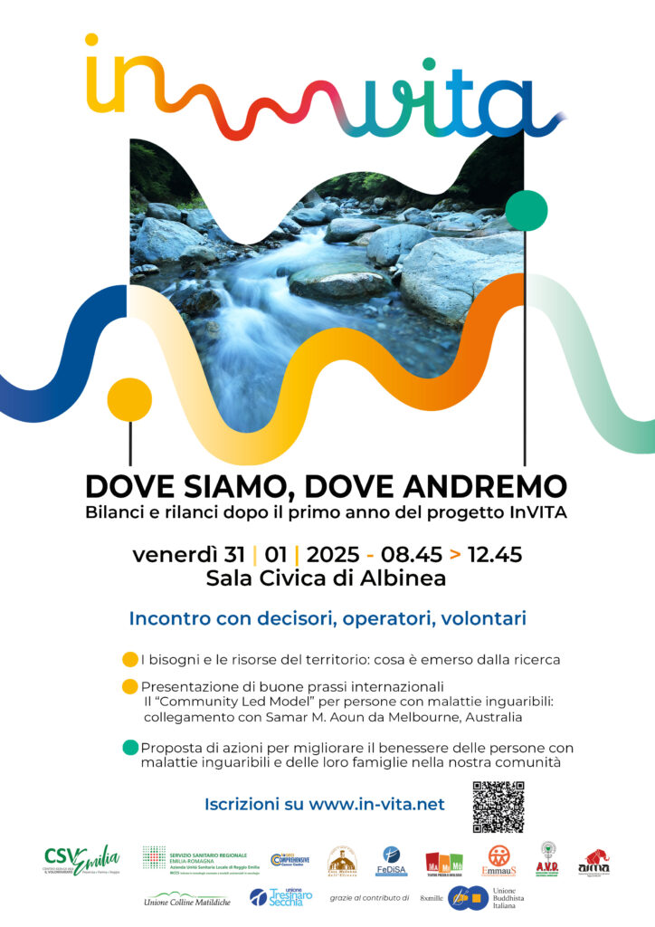 Durante il convegno saranno, quindi, presentati i risultati della ricerca condotta nel 2024 dai partner di InVITA con la supervisione scientifica di AUSL IRCCS, per rilevare i bisogni delle persone affette da malattie inguaribili e delle loro famiglie, ma anche le risorse già presenti sul territorio su cui essi possono contare. Risorse messe in campo dalle famiglie stesse, ma anche da numerose associazioni e servizi: una “rete di cura” che, se maggiormente conosciuta, potrà aumentare la sua efficacia e il suo impatto sul benessere dei cittadini.