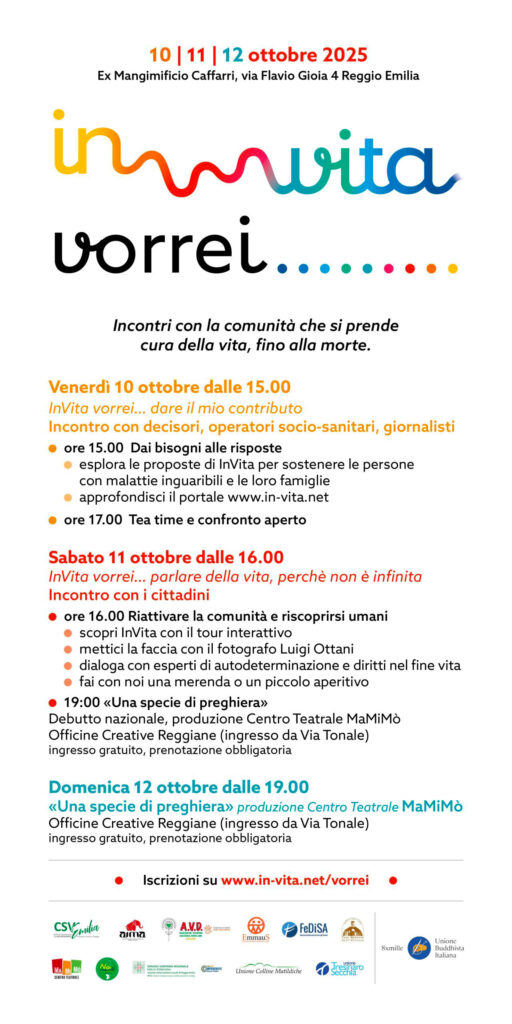 Quest’anno InVITA promuove il convegno “InVITA Vorrei…”, un ciclo di tre incontri dedicati alla comunità che si prende cura della vita fino al suo termine. Gli appuntamenti si terranno dal 10 al 12 ottobre presso l’Ex Mangimificio Caffarri di via Gioia n.4 a Reggio Emilia e saranno rivolti a pubblici differenti.