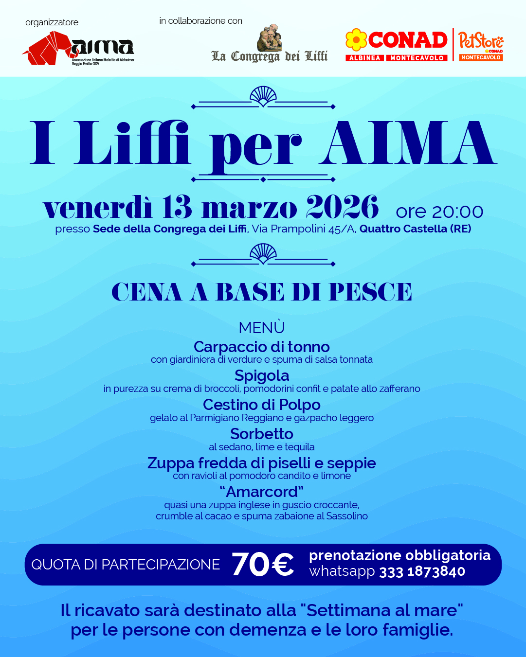 L’evento nasce dal desiderio di unire l’alta cucina di pesce della Congrega all’impegno sociale di AIMA Reggio Emilia Odv.