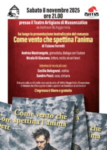 Sabato 8 novembre alle ore 21:00 presso il Teatro Artigiano di Massenzatico, in Via Beethoven n. 90 si terrà la presentazione del secondo romanzo giallo del Dott. Tiziano Ferretti: “Come vento che spettina l’anima”.