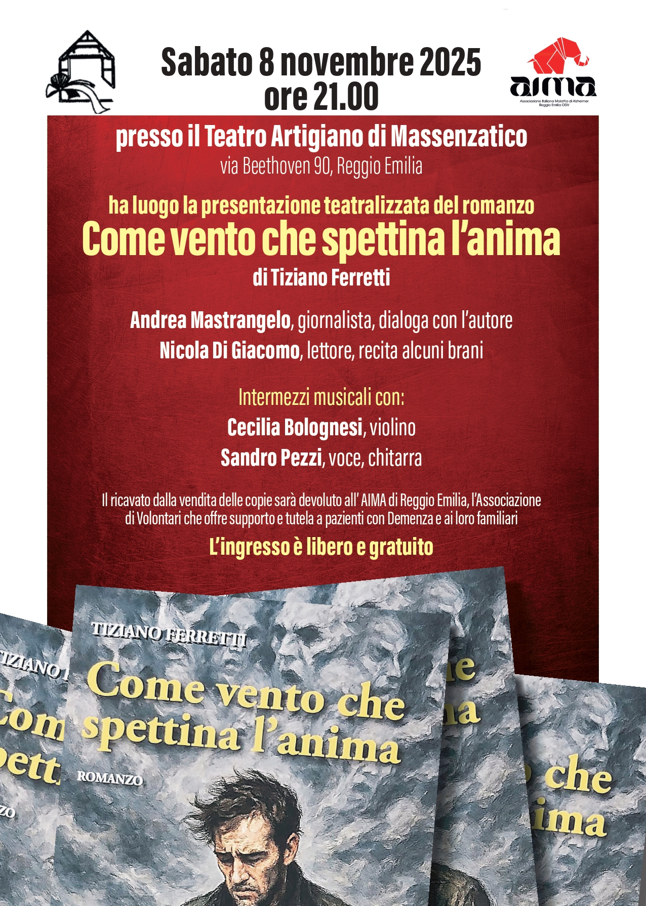 Il ricavato dalla vendita delle copie del libro durante la serata sarà interamente devoluto ad AIMA Reggio Emilia ODV, a supporto delle persone con demenza e dei loro familiari.